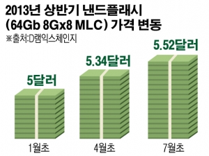 실제로 D램익스체인지에 따르면 낸드플래시 주력제품인 64Gb(기가비트) 8Gx8 MLC 고정거래가격은 지난 1월 5달러를 기록한 이후 이달 상반기에는 10% 가까이 오른 5.52달러까지 치솟았다. 32Gb 8Gx8 MLC 제품도 같은 기간 동안 2.51달러에서 3.58달러로 30% 가까이 가격이 뛰었다.