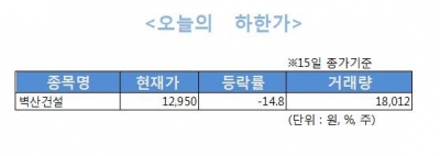 15일 국내 주식시장에서는 코스피시장 상장사인 벽산건설 1종목만 하한가를 기록했다.