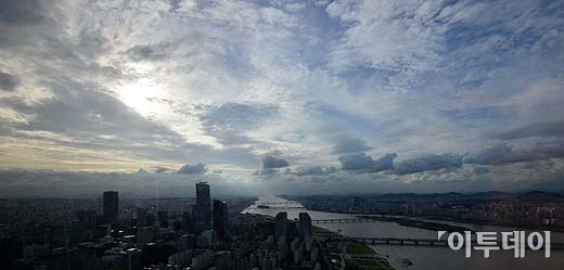 집중호우가 잠시 소강상태를 보인 15일 오후 서울 여의도 63빌딩에서 바라본 하늘이 비구름이 걷히며 맑은 하늘을 보이고 있다. 방인권 기자 bink7119@