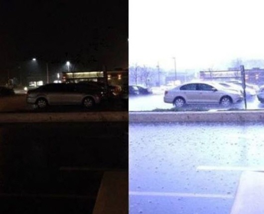 공개된 사진을 살펴보면 좌측 사진은 밤에 주차장에 주차된 사진이다. 하지만 오른쪽 사진은 같은 장소에서 찍었지만 대낮을 방불케 할 정도로 환하다. 같은 공간이지만 번개가 칠 때 그 빛에 의해 순간 환해진 것이다.