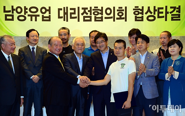 남양유업과 피해자대리점협의회 간 협상이 타결됐다. 김웅 남양유업 대표이사와 이창섭 피해자대리점협의회 회장이 18일 오전 중림동 LW컨벤션에서 가진 기자회견에서 협약서를 교환 후 악수를 하고 있다. 노진환 기자 myfixer@