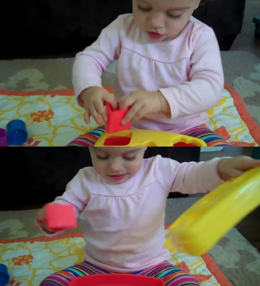 이 아기는 세모난 블럭을 들고 맞는 구멍을 찾으려 하지만 실패로 돌아간다.