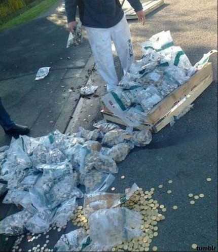 사진을 살펴보면 한 청년이 엄청난 양의 동전을 길바닥에 쏟은 채 어쩔 줄 몰라 하고 있는 모습이다.