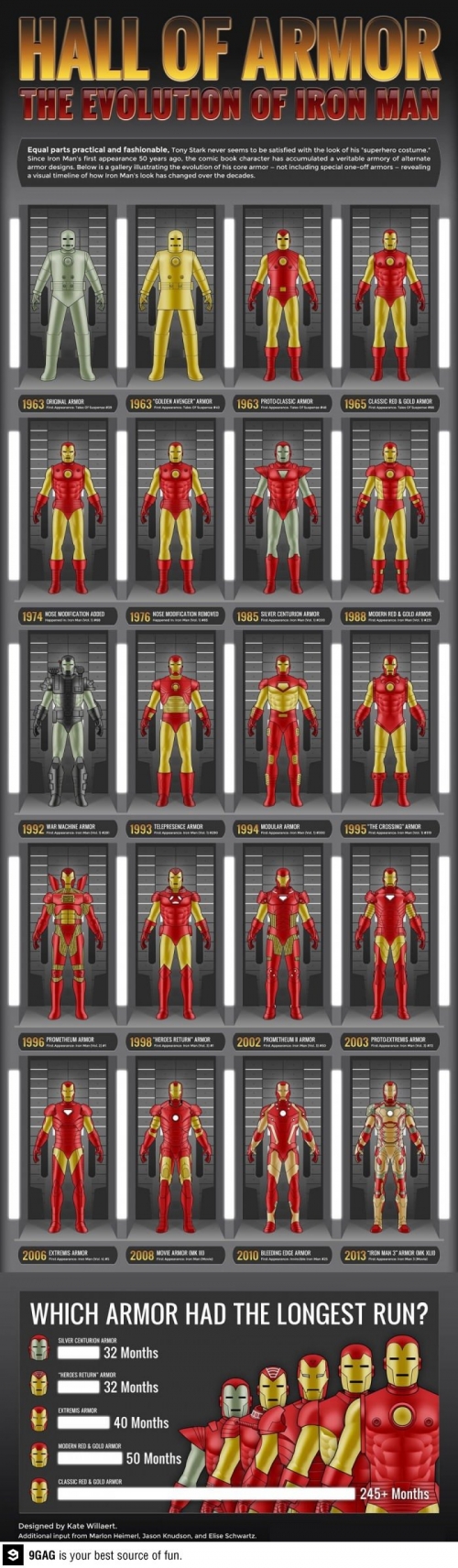 사진 속에는 1963년 아이언맨의 탄생부터 2013년 아이언맨의 최종모델까지 시대별로 나열돼 아이언맨 매니아들을 흥분시키고 있다.