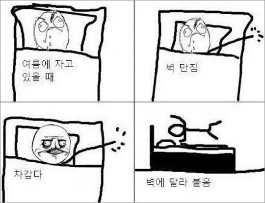 방법은 침대에 누웠을 때 더위를 느낄 경우, 침대 옆에 있는 벽이 차가우니 그 벽에 달라붙는 것이다.