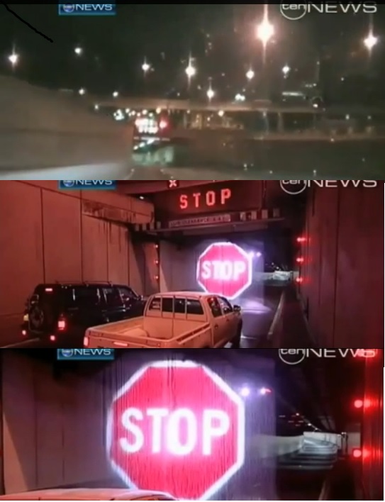 게재된 동영상을 보면 차가 도로를 달리는 가운데 다리 아래서 'STOP'이라는 전광판이 깜박인다. 이윽고 다리위에서 물줄기가 쏟아지고 그 위로 빛이 투과되면서 'STOP'이라는 글씨가 보인다.