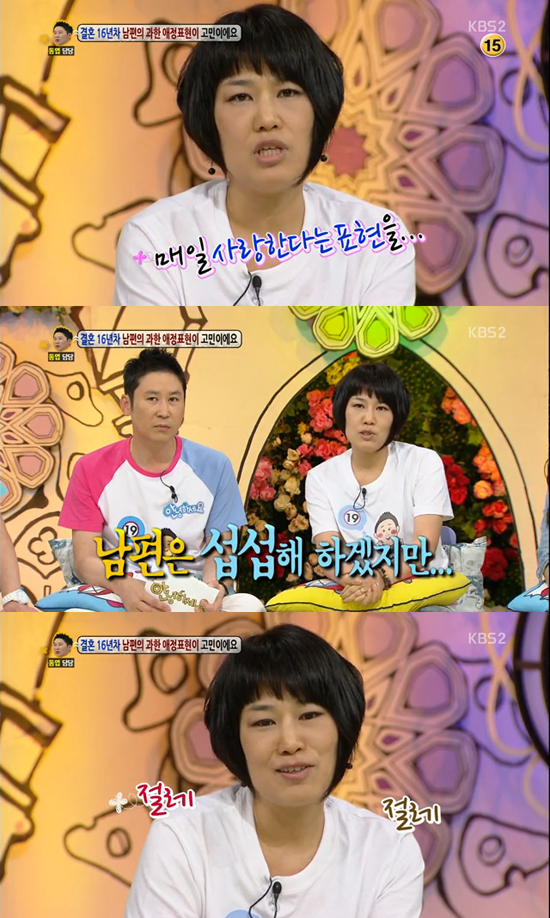 22일 방송된 KBS 2TV 예능프로그램 ‘대국민 토크쇼 안녕하세요’에서는 결혼 16년차 남편의 과한 애정표현이 고민이라는 사연이 공개됐다.