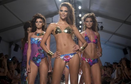 미국 플로리다주 마이애미 비치에서 19일(현지시간) 열린 메르세데스-벤츠 패션위크 ‘돌로레스 꼬르떼스’ 쇼에 참가한 모델들이 런웨이에서 다양한 비키니를 선보이고 있다. 마이애미비치/AP연합뉴스