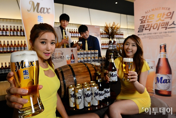 하이트진로의 100% 보리 맥주 맥스(Max)가 출시 8년을 맞아 새로운 모습으로 다시 태어났다. 23일 오전 서울 플라자호텔에서 모델들이 새롭게 출시된 하이트진로 올뉴 맥스(All new Max)를 소개하고 있다. 새롭게 리뉴얼된 맥스는 두 원료의 최상의 비율로 쌉싸름한 맥주 특유의 맛은 더욱 깊어지고, 보다 풍부한 풍미를 제공한다. 노진환 기자 myfixer@