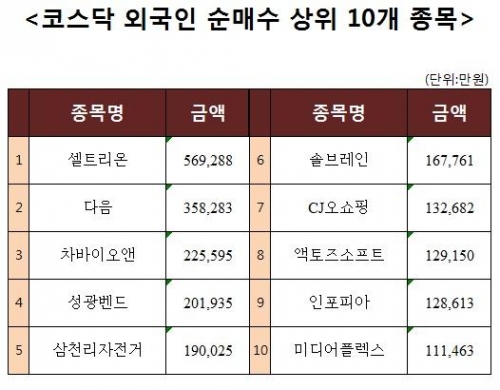 [코스닥 외국인 순매수 상위 10개 종목]