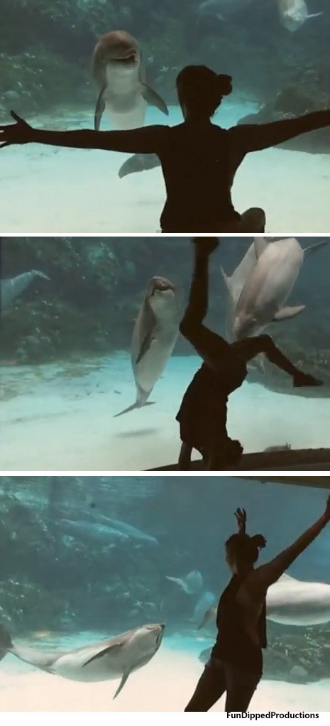‘입장 바뀐 돌고래’ 영상은 수족관을 찾은 체조 선수들이 촬영했으며 한 여성이 돌고래 앞에서 체조 동작을 선보이고 돌고래는 여성의 묘기를 빤히 쳐다보고 있어 돌고래와 사람의 입장이 바뀐 모습으로 웃음을 자아낸다.