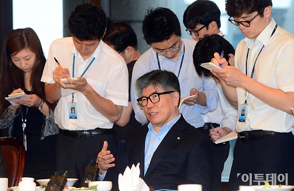 김중수 한국은행 총재가 24일 오전 남대문로 한국은행 본관에서 열린 경제동향간담회에서 참석자들과 환담하고 있다. 노진환 기자 myfixer@