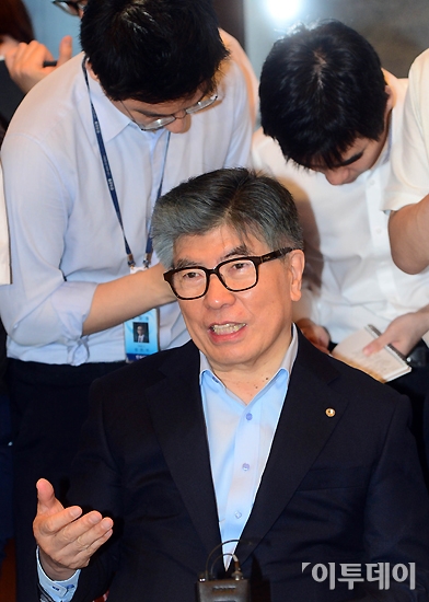 김중수 한국은행 총재가 24일 오전 남대문로 한국은행 본관에서 열린 경제동향간담회에서 참석자들과 환담하고 있다. 노진환 기자 myfixer@