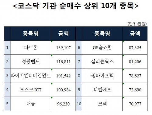 [코스닥 기관 순매수 상위 10개 종목]