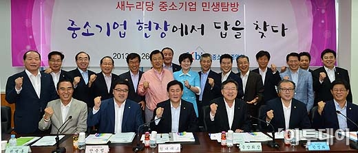 (앞줄 왼쪽 세번째부터)최경환 새누리당 원내대표와 김기문 중소기업중앙회 회장, 한정화 중소기업청장, 김재홍 산업통상자원부 1차관 비롯한 중소기업관계자들, 새누리당 관계자들이 26일 오후 새누리당 중소기업 민생탐방 두 번째 순서로 경기 안산시 단원구 목내동 ㈜광명전기를 찾아 기념촬영을 하고 있다. 방인권 기자 bink7119@