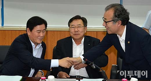 최경환 새누리당 원내대표와 김기문 중소기업중앙회 회장, 한정화 중소기업청장이 26일 오후 새누리당 중소기업 민생탐방 두 번째 순서로 경기 안산시 단원구 목내동 ㈜광명전기를 방문해 인사를 나누고 있다. 방인권 기자 bink7119@