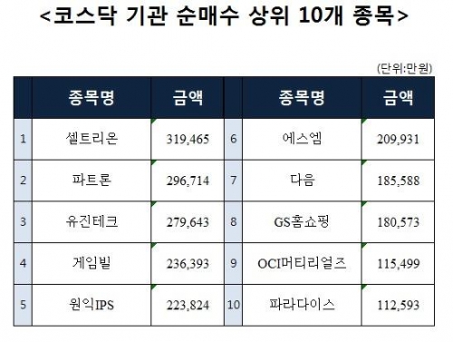 [코스닥 기관 순매수 상위 10개 종목]