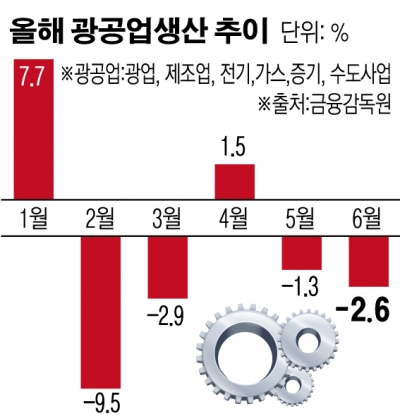 광공업생산은 지난달보다 0.4% 증가했지만 지난해 같은 달보다 2.6% 감소했다. 광공업생산이 작년보다 감소하는 폭은 지난 5월 -1.3%이었던 것보다도 더 커졌다. 지난해와 비교할 때 특히 제조업 부문에서 영상음향통신(-20.7%), 자동차(-4.4%) 등이 크게 줄었다.
