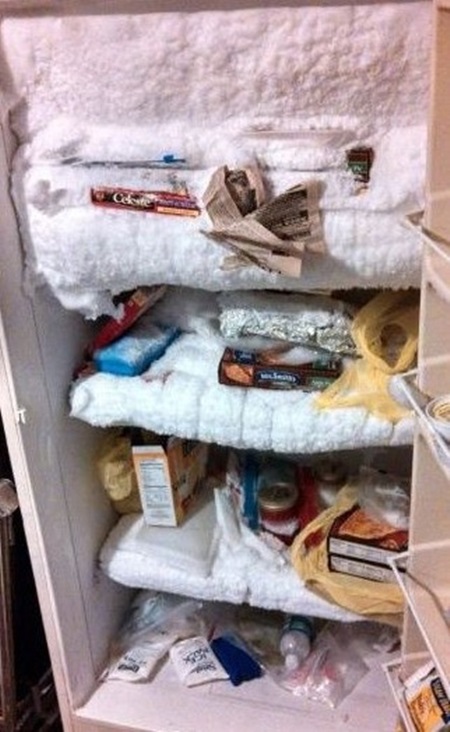 최근 각종 온라인블로그에는 '공포의 냉장고' 시리즈 3탄이 올라왔다. '공포의 냉장고' 사진 속에는 냉장고를 열자마자 꽁꽁 얼어붙은 얼음 속에 파묻힌 음식들이 널려 있다. 냉장고에서 음식을 꺼내려해도 얼음과 함께 얼어버려 아무것도 꺼내 먹을 수 없는 상황.