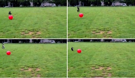 공개된 영상에는 작은 강아지 한 마리가 자기 몸의 두 배는 족히 되는 빨간 공을 가지고 노는 모습이 담겨 있다.