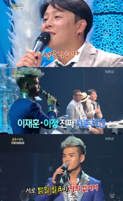 MC 신동엽이 "무리수 두지 말라"고 말하며 이정을 의심하기도 했다. 이에 쿨의 이재훈은 "정말 맞다"며 "친사촌"이라고 사촌지간임을 확인해줬다.