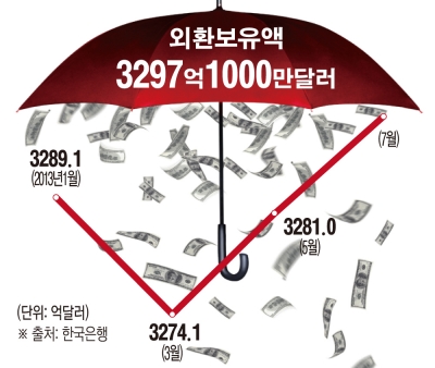 외환보유액은 지난 1월 사상 최고를 기록한 이후 2월 3274억달러로 떨어진 뒤 3월(3274억1000만달러), 4월(3288억달러)에는 두달 연속 증가했다. 그리고 다시 5(3281억달러), 6월(3264억4000만달러)에는 감소했다.