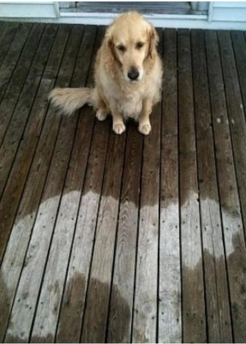 사진속에는 비에 젖은 개 한 마리가 자신이 누워 있던 자리를 바라보고 있는 모습이 담겨 있다. 개의 처량한 눈빛이 마치 주인에게 "비가 오는데 왜 나를 안 깨웠어"라고 원망하는 것처럼 보여 웃음을 자아낸다.
