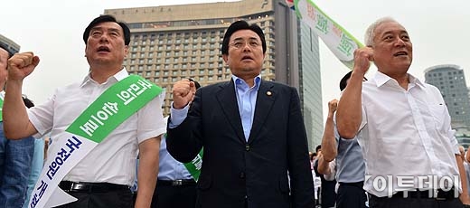 김한길 민주당 대표(오른쪽), 전병헌 원내대표(가운데) 등 당 관계자들이 6일 시청앞 서울광장 국민운동본부 사무실에서 열린 최고위원ㆍ국회의원ㆍ지역위원장 연석회의에서 구호를 외치고 있다. 방인권 기자 bink7119@