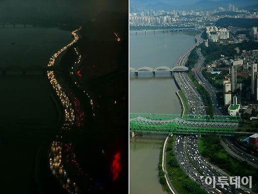 중부지방이 북태평양 고기압 가장자리에 들어선 6일 서울 곳곳에 비가 쏟아진 후 맑게 갰다. 이날 오후 한시경 63빌딩에서 바라본 올림픽대로에서 밤처럼 어두워진 날씨에 차량들이 전조등을 켜고 운행하고 있다. 오후 네시경 비가 그치고 이내 맑은 모습을 보이고 있다. 양지웅 기자 yangdoo@