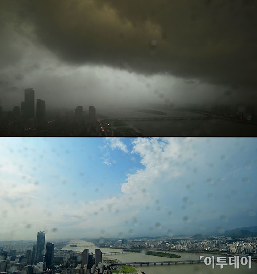 중부지방이 북태평양 고기압 가장자리에 들어선 6일 서울 곳곳에 비가 쏟아진 후 맑게 갰다. 이날 한시경 63빌딩에서 바라본 서울 하늘에 먹구름이 잔뜩 드리워 있다. 같은날 네시경 맑은 모습을 보이고 있다. 양지웅 기자 yangdoo@