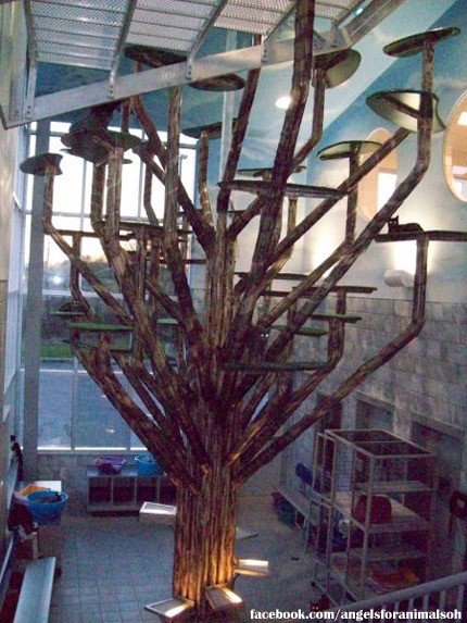 놀이터는 높이 7미터가 넘을 뿐만 아니라 가지가 36개에 이른다. 인공 나무는 고양이들이 마음껏 뛰어놀고 숨고 쉬라고 만든 것이다.