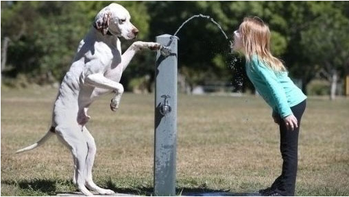사진 속 '물 주는 개' 사진에는 주인으로 보이는 어린 소녀에게 물을 주기 위해 개가 일어서서 펌프를 누르고 있다.
