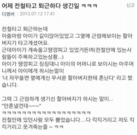 엄마가 시끄럽게 우는 아이에게 "계속 울면 옆에 있는 할아버지에게 혼단다"고 말했다. 하지만 옆에 있던 할아버지는 "안 혼낼껀데~" 라며 끼어들어 주위사람들의 웃음을 유발했다.