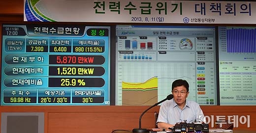 윤상직 산업통상자원부 장관이 11일 오후 서울 강남구 삼성동 한국전력 회의실에서 열린 ‘전력수급위기 대책회의’에서 모두발언을 하고 있다. 방인권 기자 bink7119@