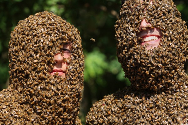10일(현지시간) 캐나다 온타리오주 에일머 클로버의 모험농장에서 연례 행사가 진행된 가운데 두 참석자가 그들의 '벌 턱수염'을 보여주고 있다.