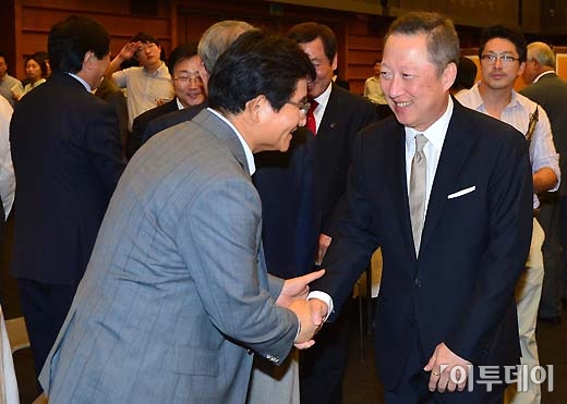 박용만 두산그룹 회장이 12일 서울 남대문 대한상공회의소 의원회의실에서 열린 서울상의 임시의원총회에서 만장일치로 서울상의 회장에 선출됐다. 이날 총회에서 박 회장이 상의 의원들고 악수를 나누고 있다. 박 회장은 서울상의 회장이 대한상의 회장에 추대되는 관례에 따라 오는 21일 대한상의 임시의원총회에서 대한상의 회장으로 선출될 전망이다. 양지웅 기자 yangdoo@
