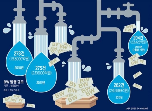 분리형 BW 발행은 지난 2010년 273건(1조8000억원)에서 2011년 275건(2조6000억원), 지난해 262건(2조5999억원)을 기록했다.