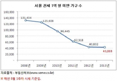 부동산정보업체 부동산써브는 8월 1주차 시세 기준 서울 아파트(주상복합 포함) 총 118만4606가구를 대상으로 전세가를 조사한 결과, 1억원 미만 가구 수가 2008년(13만1434가구)의 3분의 1 수준인 4만3003가구로 나타났다고 13일 밝혔다.