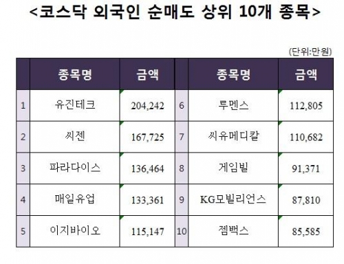 [코스닥 외국인 순매도 상위 10개 종목]