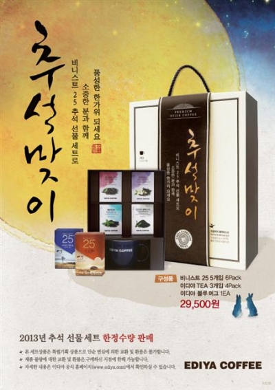 이번 추석선물세트는 이디야커피가 국내 커피전문점 최초로 선보인 스틱원두 제품 ‘비니스트25’를 중심으로 구성됐다. 비니스트25 오리지널(5개입) 및 마일드(5개입)를 포함해 잉글리쉬블랙퍼스트, 얼그레이, 페퍼민트, 로즈자스민 등 4종의 차(茶) 각 3개, 이디야 블루 머그잔 1개 등이 담겨있다. 가격은 2만9500원.