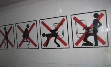 두 번째 화장실 사용 금지 경고문에도 역시 남녀간 원초적 본능 해소나 이상한 자세로 볼 일을 보지 말 것을 주문하고 있다.