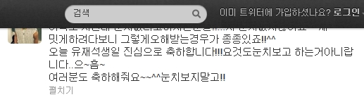 14일 정준하는 자신의 트위터에 “아직도 저한테 눈치 없다고 하시는 분들! 저 눈치 없지 않아요~ 재밌게 하려다 보니 그렇게 오해받는 경우가 종종 있죠. 오늘 유재석 생일 진심으로 축하합니다~ 요것도 눈치 보고 하는 거 아니랍니다. 여러분들도 축하해줘요. 눈치 보지 말고!”라는 글을 트위터에 올리며 유재석 생일을 축하했다.