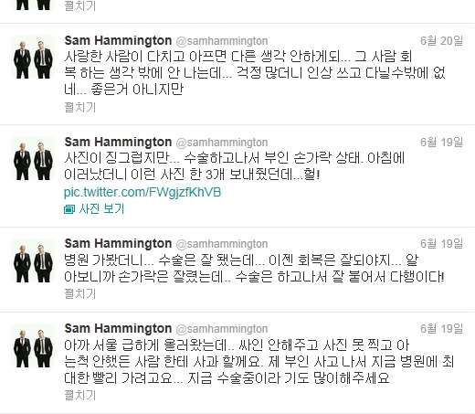 지난 6월 샘 해밍턴은 자신의 트위터를 통해 아내의 사고 소식을 알린 바 있으며 많은 사람들은 그의 트위터를 통해 아픔을 나눴다.