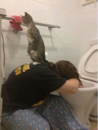 사진 속에서 고양이는 술에 취해 토 하는 주인의 등위에 올라타 있는 모습이다. 마치 속이 좋지 않은 주인의 등을 두드려주는 모습이어서 웃음을 자아내고 있다.