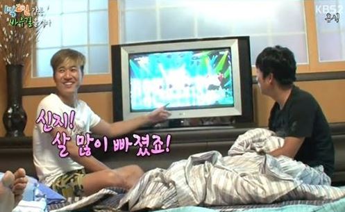 김종민은 18일 방송된 KBS 2TV '해피선데이-1박2일'에서 TV를 보다 신지가 나오자 “살 많이 빠졌죠?”라며 흐뭇한 미소를 지었다.