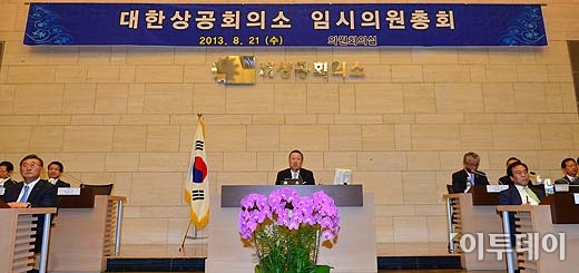 박용만 두산그룹 회장이 21일 오전 서울 중구 남대문로 상의회관에서 열린 ‘대한상공회의소 임시의원 총회’에서 만장일치로 제 22대 대한상공회의소 신임회장으로 선출됐다. 박용만 신임대한상의 회장이 임시의원총회를 주재하고 있다. 방인권 기자 bink7119@