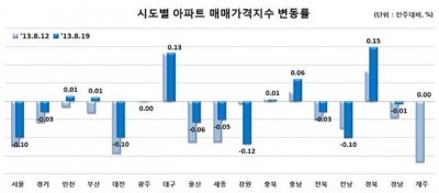 시도별로는 △강원(-0.12%) △전남(-0.10%) △서울(-0.10%) △대전(-0.10%) △울산(-0.06%) △세종(-0.05%) 등의 순으로 하락했다. 그러나 경북(0.15%), 대구(0.13%) 등은 상승했다.