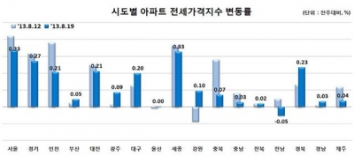 시도별로는 △서울(0.33%) △세종(0.33%) △경기(0.27%) △경북(0.23%) △대전(0.21%) △인천(0.21%) △대구(0.20%) △강원(0.10%) 등의 순으로 올랐다.