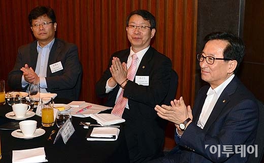 최수현 금융감독원장과 김근수 여신금융협회 회장을 비롯한 참석자들이 22일 오전 서울 영등포구 여의도동 콘래도호텔에서 열린 ‘여신금융회사 대표이사 간담회’에서 박수를 치고 있다. 방인권 기자 bink7119@