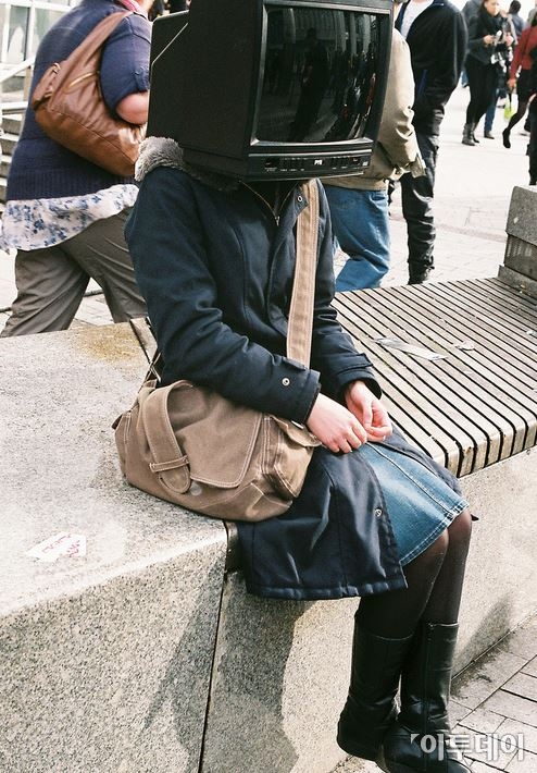 사진 속 여성은 치마를 입은 채 TV를 쓰고 거리에 앉아 있다.